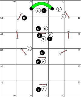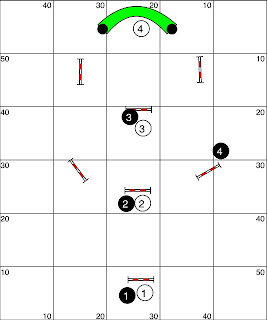 First we did the white numbered sequence which was designed to allow the dog to move in a mostly straight line and then we did the black numbered sequence designed to start to teach the handlers and dogs the differences in handling between running straight ahead and turning. In between doing some of the other sequences we occasionally ran the white numbers to give the dogs an easy sequence to keep them from thinking that every sequence was going to be about turning.